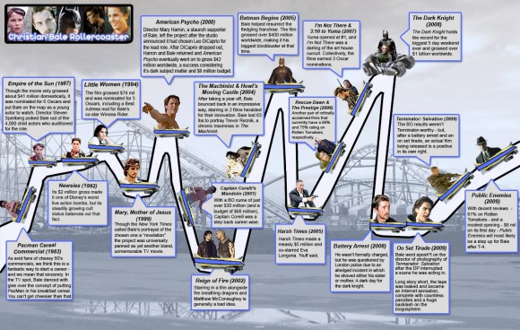 Yet his film choices over the years teeter between obscure (Reign of Fire, Capt. Corelli’s Mandolin) and spectacular (3:10 to Yuma, Batman Begins, The Dark Knight). Still it’s fascinating to follow what the folks at Moviefill calls the Bale roller-coaster career.