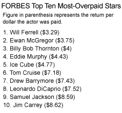 Forbes released their annual most-overpaid stars list last week. To create the list, Forbes looked at the 100 biggest stars in Hollywood. To qualify, each actor had to have starred over the last five years in at least three movies that opened in more than 500 theaters. Three of them were repeat offenders, including the ‘winner’ Will Ferrell, Drew Barrymore and Jim Carrey, who were also on the 2008 list of overpaid-stars. Which begs me the question, why on earth would the studio still want to pay them the big bucks??! It’s also an amusing coincidence that last year’s topper Nicole Kidman — who earned a mere buck for every dollar she was paid — starred with Ferrell in the darn-awful Bewitched in 2005, which not-surprisingly only managed to rake $63 million of the 85-mil budget.