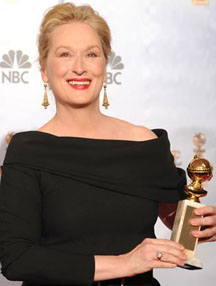 Colin Farrellpresents Best Supporting Actress in Musical/Comedy award, he doesn’t look drunk to me, Ricky, what are you talkin’ about? 😉 Darn, Meryl is nominated again, TWICE no less!! Well at least there’s NO WAY Julia Roberts is gonna win that undeserved nom for Duplicity. Well, Streep beats herself in It’s Complicated to win the award for Julie & Julia. She was ultra fabulous as Julia Child, so no qualms from me there. Her tribute to her mother is funny and moving. Shows how much clout she has in this biz that she isn’t rushed at all despite her longish speech.