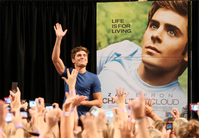 • Apparently teen heartthrob Zac Efron was at the Mall of America a couple of nights ago. The local radio tipped me off and I got a chuckle out of the reporter who was covering the event as she had to bring several earplugs! He’s promoting his new tearjerker drama Charlie St. Cloud. Man, I’m glad I wasn’t there that day (my office is relatively close to it so sometimes I stopped by after work), I mean check out this massive crowd! The reporter said there could easily be 10,000 people there. That’s just mind-boggling to me, ok so we MN folks don’t get to see Hollywood celebs very often but still! Anyhoo, I personally think the dude is practically a living breathing personification of a Ken doll, but I’m obviously not his target market. To be fair though, Zac just might be a decent actor (he earned some raves in Me & Orson Wells a couple of years back), though he probably ain’t going to shed his matinee idol image with his new flick. And apparently the marketing department was too busy framing Zac’s face just so in the poster they didn’t bother thinking about the slogan. LIFE IS FOR LIVING? Seriously, why bother!