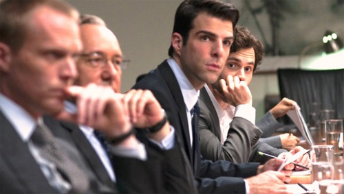 The key players work at a nameless investment bank in New York City. It begins with the lay-off of a veteran risk management executive named Eric Dale (the always excellent Stanley Tucci). As he’s escorted out of the building, he hands over a flash drive to his subordinate Peter Sullivan (Zachary Quinto) with a word of caution, ‘be careful.’