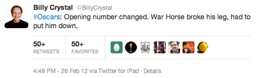 Ok, that’s about the extent of my red carpet coverage, as I’m really just about the ceremony and see if my Oscar predictions make out. For one I’m quite excited to see Billy Crystal as host, his ninth time! He was already making jokes about his opening number via Twitter before the ceremony started: