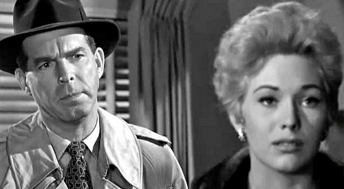 The film’s back lot, claustrophobic, shadowy, rain slicked look and Noir feel fit Mr. MacMurray’s Sheridan like a glove as he stakes out Lona’s tiny apartment in its U-shaped complex. With a plethora of high dolly shots that make Sheridan’s trench coated shadows stretch even longer. Selling his soul to the devil as he lies to his partner, Rick McAllister, well played by Philip Carey and paternal overseer, Paddy Dolan. Fudges reports to his by the book boss, Lt. Eckstrom, a sturdy, aspiring E.G. Marshall. Then slither away to see Lona and their plans quickly head south. Culminating with a few unexpected, noisy, greed motivated murders that leave no one the better.