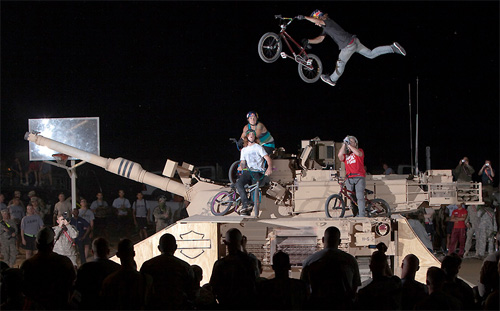 Bikes over Baghdad was a tour comprised of a team of a dozen action sports heros and legends. We traveled to the middle east six separate times with each tour roughly two weeks in length, facing extreme conditions, mortar rounds, IED’s, injury, exhaustion and more, but never missing a show. And while the team read like a who’s who of action sports, egos were put aside and nothing short of a series of miracles were performed.