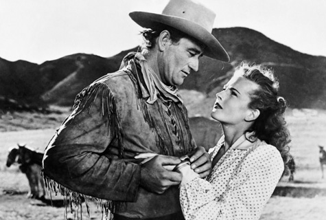 En route, a wagon train full of settlers in ambushed by Indians and Clift rides to the rescue. Staving off a second wave attack and then aiding Tess Millay (Joanne Dru). Gorgeous, worldly, with a spine of steel. Who doesn’t scream or panic when an arrow pierces her shoulder. Instantly intrigued by this handsome hero who removes the arrow and patches her up as the Indians retreat. Then using her discreet wiles, finds out more about Clift’s troubled Matt Garth. His life, dreams and tenuous relationship with his adoptive father, John Wayne’s Thomas Dunson.