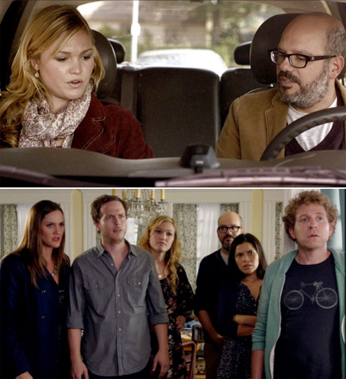 You could call this a relationship comedy as we meet a bunch of quirky (read: crazy) characters all gather in one room together trying to attempt a civil brunch together. Stiles plays a doctor who’s bringing history teacher Glen (David Cross) on their third date to meet her friends.  The hosts are married couple Emma (Erinn Hayes) + Pete (Blaise Miller), and the guests are free-spirited married couple Lexi (Rachel Boston) + Buck (Nic Cage-lookalike Kevin M. Brennan), and the long-engaged Hedy (America Ferrera) + the alien conspiracy-obsessed Shane (Jeff Grace).
