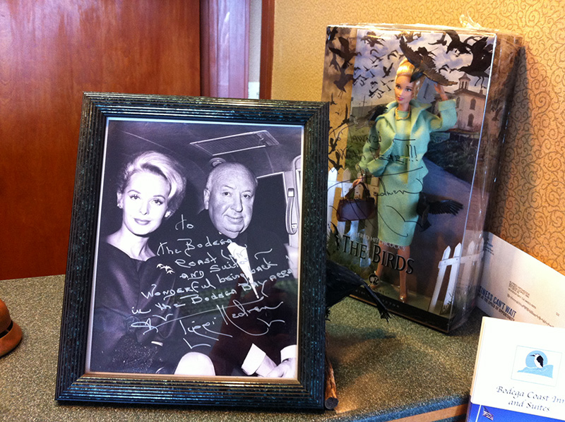 As we were checking out of the Bodega Coast Inn, I was dismayed to find out that just a week ago, Tippi Hedren had come back to visit the town for the film’s 50th anniversary. I had just missed her. The hotel clerk said she was a very nice woman and still beautiful. On the clerks counter was an autographed publicity still of Tippi with Mr. Hitchcock along with a Barbie rendition of her as Melanie.