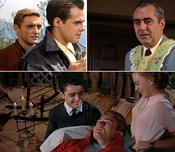 Natalie Wood on the other hand, seems miscast here as the supposedly wild teenage girl Judy. I read that director Nicholas Ray initially didn’t feel right about casting her either. Plus some of the scenes of her with her dad comes across as creepy and bizarre to me, I’m really not sure what that’s about. I wonder if someone feistier like Elizabeth Taylor, Dean’s co-star in Giant, might’ve been a better fit. Sal Mineo (who looked a lot like Ralph Macchio) is quite good as John aka Plato, a forlorn young boy from a privileged family who idolizes Jim. Plato’s looking for a father figure and somehow he finds that in Jim who obviously is lacking an adequate parental figure himself. Right from the start, there’s a strange parallel between the two as Plato was also arrested the same night as Jim. Given the strict Hays Code at the time, the homosexuality factor is never mentioned, but it’s glaringly obvious that Plato has a thing for Jim. Two other performers worth mentioning here is Jim Backus who played a key role as Dean’s father and there’s a very young, baby-faced Dennis Hopper in a small role as one of Buzz’s inner circle.