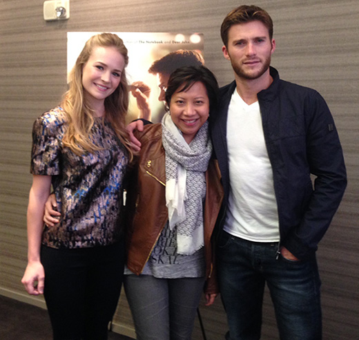 Scott: that’s a great question, we had not been asked that question before. Actually you know what, I ‘m really proud how this movie turned out, extremely proud. And that doesn’t happen all the time. You do movies and sometimes they turned out well, so-so, so you go ‘well we gave that a shot.’ And that happens with great scripts, sometimes they turned to so-so movies, you get that with mediocre script and they turned into great movies. I think I really enjoyed in the book, that when Luke first met Sophia, Nicholas Sparks described it as ‘ a comfortable silence’ that you have with people and I think that happens with people you fall for. There’s something really nice about how she comfortable she felt with his silence, there doesn’t need to be words. And I strongly pushed my opinion about that scene when they first met, but I think some of them end up in the cutting room floor and that’s what happened. We did film a lot more of that opening scene.