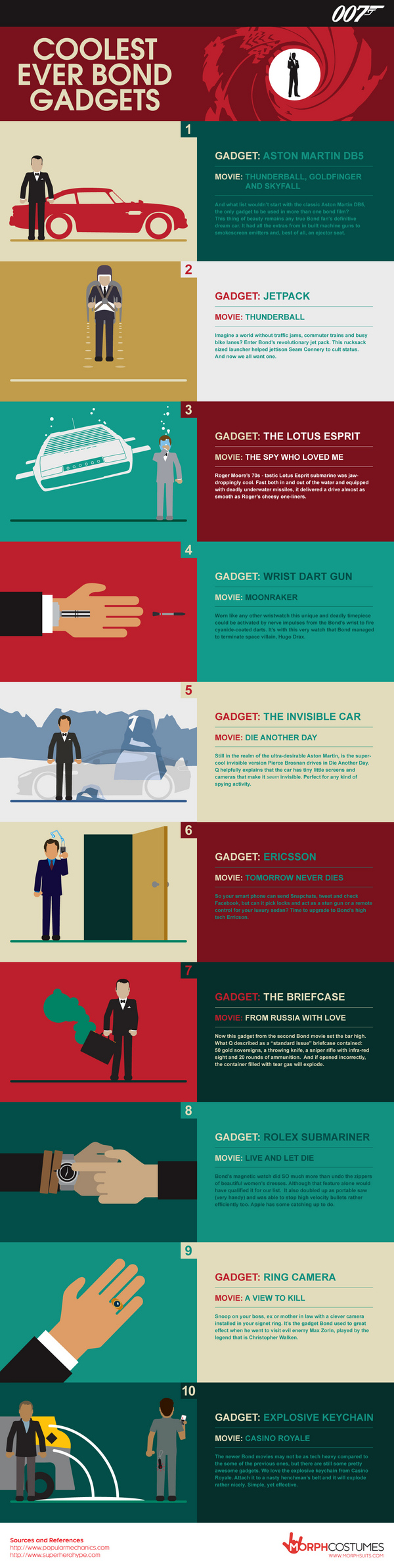 This month’s Five for the Fifth’s guest is a longtime friend and fellow Bond fan Dan from Top 10 Films site! Dan’s posted a myriad of Bond-related top 10s, including top 10 Bond gadgets from contributor Rodney aka Fernby Films, so it’s no surprise that his question would be gadget-related. Check out this awesome infographic on this very topic!