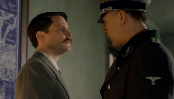 This film has two parallel narratives that start in opposition and end in convergence: one is Otto and Anna’s actions, the other is the investigation. The first is focused on the smallness of the couple’s actions in contrast to the enormous risk they are taking, like a pair of mice squeaking at roaring lions. The filming, colour palette and period setting are drab and lifeless; the atmosphere is paranoid with suspicion and mistrust; and the acting is subdued and understated. Brendan Gleeson and Emma Thompson are actors with broad performance repertoires but here they are minimalist in expression and Spartan in dialogue, with much being conveyed through furtive glances or avoided eye-contact. It is a slow-moving story, observant of small details in an alienated world. This has the effect of amplifying the intensity of Otto and Anna’s actions. Close-ups of a pen leaving a trail of outrage on a small white card become powerful portraits of bravery that are ultimately futile as most of the cards were handed in to authorities. The couple’s nemesis is a young German investigator (Daniel Brühl) who pursues his work with ideological fervour for the Fuhrer but whose success turns into the film’s most devastating moments of despair.