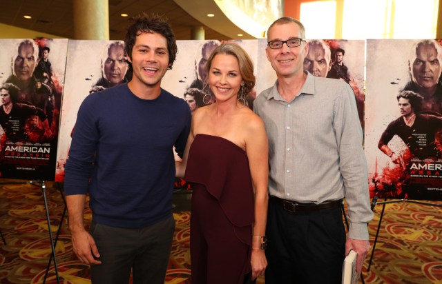 Author Kyle Mills and Dylan O’Brien posed with Lysa Flynn on September 8, 2017