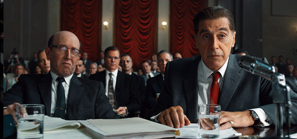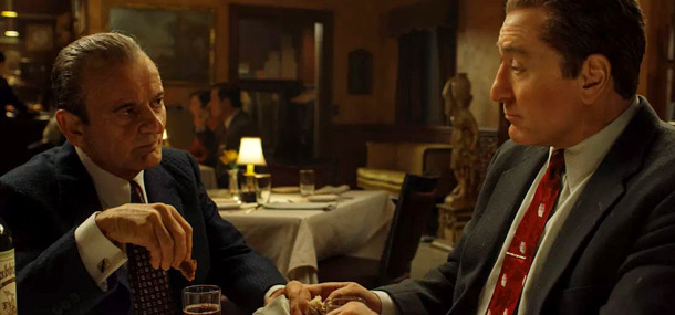 De Niro plays a reserved, soft spoken deliberate man. His drawn back approach is perfect for the character. On the other end of the spectrum, Al Pacino‘s character, Jimmy Hoffa is the exact opposite. A loud, brash personality who reeks of desperation. Pacino puts every ounce of energy he has become known for into this performance, giving it a level of natural charm and charisma. Lastly, Joe Pesci plays Russell Bufalino, a near silent, no nonsense character who “takes care of business”.