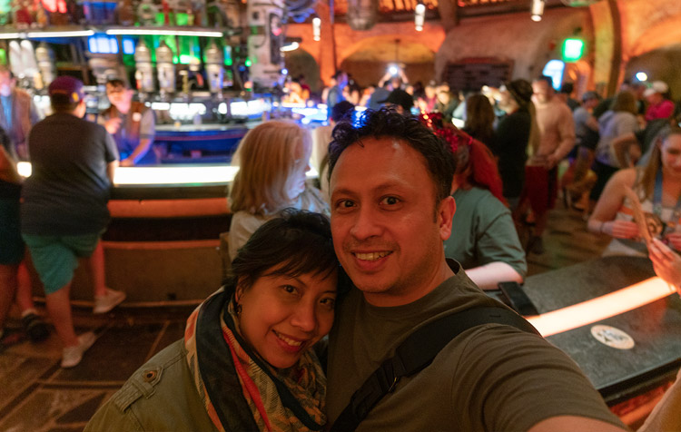 We were pretty thirsty by then, thankfully, there were only a dozen people in line in front of us. The cantina’s attendant told us it’s standing-room only since we didn’t make a reservation beforehand, then a few minutes later he escorted us inside. I love the atmosphere of the cantina, inspired by the one in 1977 Star Wars movie.