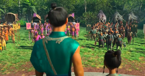 In her epic journey, Raya also encounters various characters, some more interesting than others. 10-year old boat captain Boun (Izaac Wang) and warrior giant with a big heart Tong (Benedict Wong) add some emotional layers to the story, as they deal with familial loss and loneliness. But the con-baby Little Noi with her monkey friends, not so much. In fact her scenes are perhaps my least favorite and is not the least bit funny. The comedic bits don’t always work well here, but by the third act, the movie has already shifts back to drama mode with some thrilling martial-art action thrown in. The third act also attempts to balance the backstory of Sisu’s family and the final confrontation between Raya and her main foe Namaari, and for the most part it succeeds.