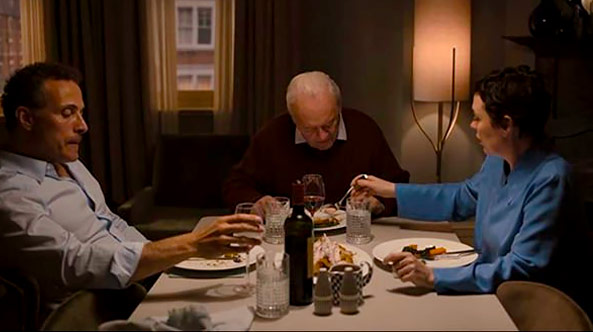 Zeller’s storytelling style really puts us, the audience, in Anthony’s mind… as soon we too, question the reality of what we’re watching. The actor switcheroo is one of the device used to make us question everything. In one scene we see Olivia Colman as Anne, then in another it’s Olivia Williams (the fact that the two actresses are named Olivia are inspired, perhaps even deliberate casting!) Same with Mark Gatiss and Rufus Sewell… uttering the same familiar dialog in their conversations while Anthony is convinced ‘there’s something funny going on’ that he keeps seeing strangers in his own home.
